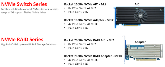 HighPoint's Gen 5 stack currently has two products each in the switch and RAID lineups - an add-in card with support for M.2 drives, and a RAID adapter with four 5.0 x8 SFF-TA-1016 (Mini Cool Edge IO or MCIO) connectors for use with backplanes / setups involving U.2 / U.3 / EDSFF drives.