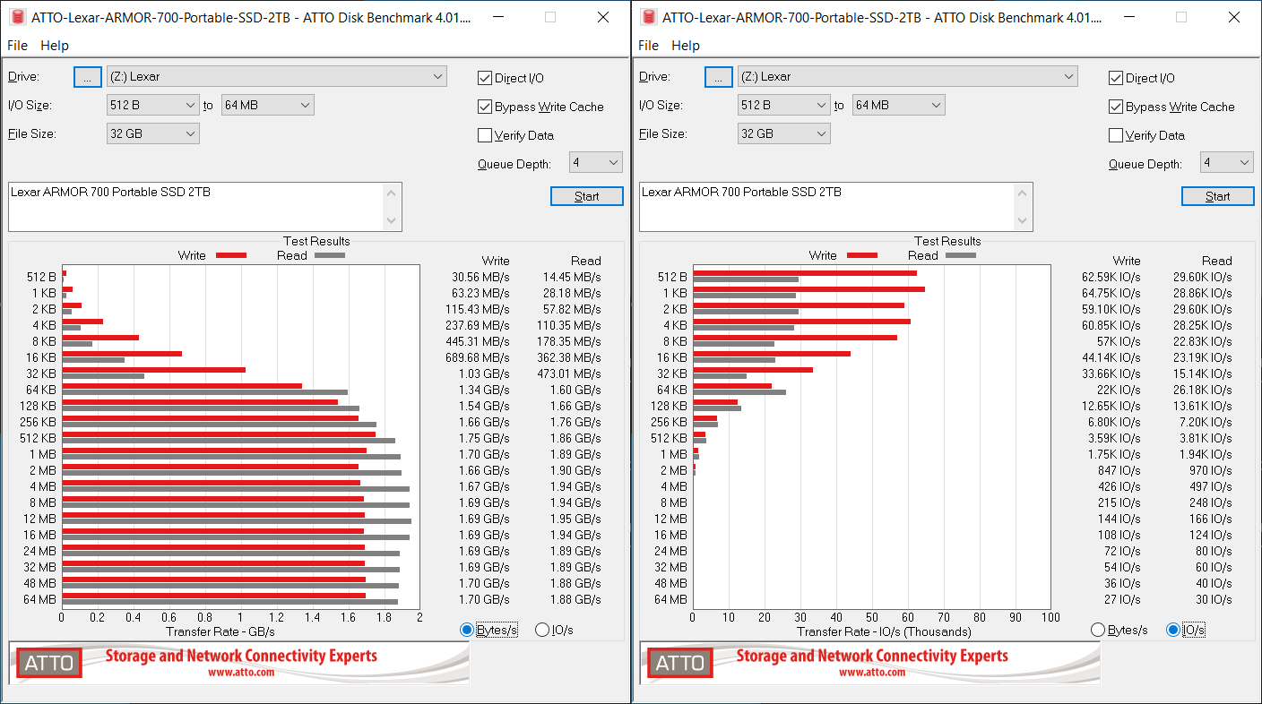 - Synthetic workloads using CrystalDiskMark and ATTO
